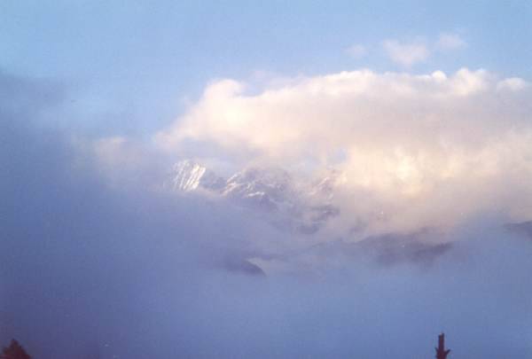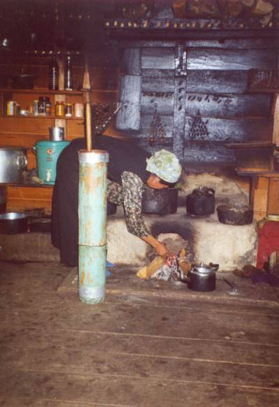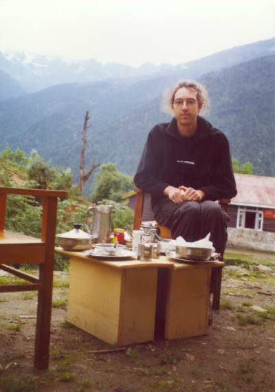 Genaue Mengenverhältnisse und Gärzeiten haben wir dem The Lhasa Moon Tibetan Cookbook Es steht jedoch fest, dass das Getränk alkoholhaltig war und wir den Genuss auch am Tag danach nicht bereut haben. Sabine: Chang wird in Bambus-Bechern serviert, mit heißem Wasser aufgegossen und durch einen speziellen Strohhalm getrunken. Sabine und ich wurden gut mit Chang versorgt, und es folgte Aufguss auf Aufguss dieses interessanten Getränkes. In der Hütte hatte sich mittlerweile das halbe Dorf versammelt und außer Chang wurde auch eine andere, uns gänzlich unbekannte, klare, alkoholische Flüssigkeit konsumiert und obgleich wir kein Wort verstanden, fühlten wir uns sehr wohl. Spätere Recherchen ergaben, daß es sich bei dem alkoholischen Getränk eventuell um Arrak (Branntwein aus Reis oder Kartoffeln) gehandelt haben könnte. Die Nacht war sehr klar und kalt und man konnte sogar die Lichter von Darjeeling in der Ferne erkennen. Wir wurden gegen 5:30 Uhr mit einem "Early Morning Tea" begrüßt und um Punkt 6:00 Uhr gab es Frühstück, welches wir im Freien vor der Hütte einnahmen. Das Frühstück bestand aus Tee oder Kaffee, Eiern in unterschiedlichster Ausführung, Brot, Marmelade, Käse und variierte jeden Tag. Wir hatten wieder Glück mit dem Wetter, denn es war zwar noch leicht bewölkt, doch es schien ein guter Tag zum trekken zu sein. Nachdem wir unsere Schlafsäcke und sonstigen Ausrüstungsgegenstände wieder verstaut hatten, begann der Aufstieg Richtung Dzongri. |