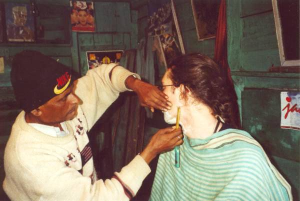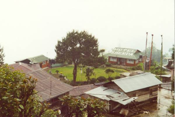 Rimbik ist eine kleine Stadt mit einem Bazar und einigen Hotels. Nachdem wir nun die letzten Tage eher einfach übernachtet hatten, suchten wir hier etwas mehr Luxus. Das Hotel Sherpa (ca. 100 Rupee) gefiel uns sofort, vor allem wegen seines schönen Gartens und der kleinen Wiese. Schnell war ein Zimmer bezogen und wenig später saßen wir im Grünen beim Mittagessen. Hier wurden auch endlich folgende Fragen beantwortet: Woher stammen die roten Markierungen auf dem Trek? Was bedeutet die Abkürzung HRT? Ein Aufkleber an der Fensterscheibe des Restaurants warb für den HRT - Himalayan Run & Trek Auf einer kleinen Tour durch den Bazar der Stadt, löste ich mein Versprechen ein, mich von einem indischen Barbier rasieren zu lassen. Obwohl der Barbier, welcher kein Wort Englisch sprach, sein Bestes gab, war mit nicht wohl bei der ganzen Angelegenheit. Er nahm extra eine neue Klinge, versuchte sehr vorsichtig zu sein und sparte die kritischen Stellen zum Teil aus. Die ganze Prozedur war eigentlich sehr angenehm, doch war ich froh als ich, körperlich unversehrt, den Laden verlassen durfte. Nicht nur Sabine interessierte sich während dieser Zeit für mich, auch andere Leute blieben auf der Strasse stehen um das Schauspiel zu verfolgen. Später am Nachmittag begann es zu regnen und wir saßen mehrere Stunden auf den überdachten Bänken im Garten unseres Hotels. Rimbik ist ein schöner, ruhiger Ort zum entspannen und Sabine wäre gerne noch einen Tag geblieben, aber unser Plan ließ dafür leider keine Zeit. Kurz nach unserer Ankunft traf auch die Engländerin mit ihrem Führer ein, auch für sie war es die letzte Etappe ihrer Tour. Während des Abendessens im Hotel berichteten wir von den Erlebnissen des Tages und das erste Bier nach langer Zeit schmeckte besonders gut. Das Hotelpersonal kümmerte sich am Abend noch um zwei Jeep-Plätze für die Fahrt nach Darjeeling, die Abfahrt sollte um 6:00 Uhr am nächsten Morgen sein. Die Nacht war jedoch schon um 5:00 Uhr vorbei, denn wir wollten vor unserer Abfahrt ja noch ordentlich frühstücken. Gegen 5:45 Uhr tauchte unser Jeep aus dem Nebel auf und wenig später ging es los in Richtung Darjeeling. Ja, und was war mit dem Hund? Wir haben den Hund noch ein paar mal gesehen, doch angesichts der großen Anzahl von Artgenossen hatte er das Interesse an uns verloren, was wir keine Minute bedauert haben. Die Jeepfahrt verlief ohne besondere Zwischenfälle und gegen Mittag kamen wir in Darjeeling an. Der Weg führte uns direkt ins Dekeling Hotel, unserer indischen Heimat. Es war gut, das Sabine vorgebucht hatte, denn wir freuten uns schon auf das gewohnte Umfeld und hatten auch keine Lust wieder mit dem ganzen Gepäck auf Hotelsuche zu gehen. Die nächsten Tage sollten der Erholung dienen, aber bis zur Abfahrt nach Sikkim waren auch noch ein paar Formalitäten zu erledigen. |