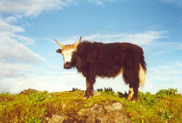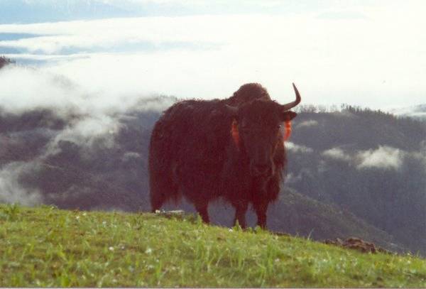 Die Strecke nach Sabarkum und Phalut geht auf einem Kamm entlang und ist überwiegend flach. Sabarkum bezeichnet eigentlich nur die Stelle, an der ein abgebranntes Steinhaus steht. Man geht in Richtung Norden und hat einen sehr schönen Blick auf das Kangchenjunga Massiv (8586m). Bisher hatten wir nur verblühten Rhododendron gesehen und wir dachten die Blütezeit wäre schon vorbei, doch hier in über 3500m Höhe wächst alles etwas langsamer. Wir sahen die ersten rot-blühenden Büsche und konnten uns auch vorstellen wie es hier vor 1-2 Wochen ausgesehen haben mag. Die ganzen Hänge müssen ein rot-rosa-weißes Blumenmeer gewesen sein. Der schöne Ausblick und die roten Büsche am Wegesrand ließen uns die Strapazen der letzten Tage schnell vergessen. Auf dem Weg nach Sandakphu hatten wir kurzzeitig geglaubt ein Yak gesehen zu haben, jetzt standen tatsächlich zwei ausgewachsene, wilde, männliche Exemplare direkt vor uns. Der Weg verlief nur etwa 10m neben ihrem Kampfplatz entlang und ihre imposante Erscheinung flößte uns einen gehörigen Respekt ein. Auf dieser Etappe hatten wir endlich die Möglichkeit, die Natur in vollen Zügen zu genießen und unsere Sonnencreme kam zum Einsatz. Dies war eine der schönsten und angenehmsten Etappen auf diesem Trek. Doch wie schon so oft, wurde das Wetter gegen Nachmittag etwas schlechter und ich kann mich nicht mehr daran erinnern ob wir Phalut noch trocken erreichten. |