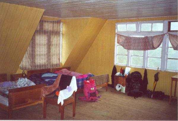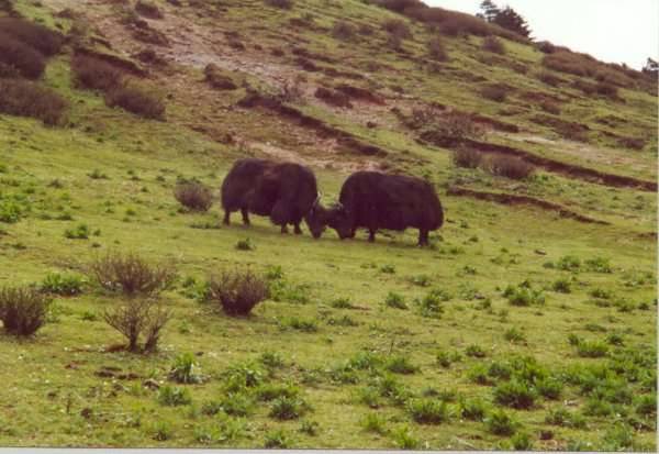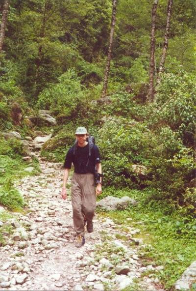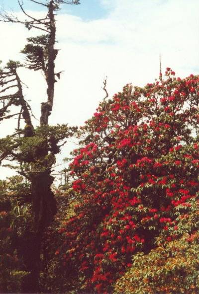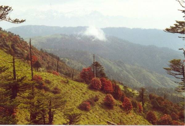 Auf Phalut gibt es nur eine Trekkers Hut, aber wir hatten wiedermal Glück und bekamen ein Zimmer nur für uns alleine. Die Buchung in Darjeeling sowie die Tatsache, daß wir Touristen aus Europa waren und Sabine ja eindeutig dem weiblichen Geschlecht angehört, erleichterte und beschleunigte anscheinend die Zimmerzuteilung, wir bekamen auf dem ganzen Trek ein Einzelzimmer. Außer uns waren noch etwa 20 Inder auf Phalut, ein paar übernachteten aber lieber in ihren eigenen Zelten. Als sich uns wiedermal die Frage stellte, ob und wann es Abendessen gibt, lernten wir einen indischen Geodäten kennen. Er erzählte uns von seiner Arbeit hier am Dreiländer-Eck Indien-Nepal-Sikkim, und daß er am nächtsen Tag mit Hilfe einiger Yaks weiterreisen würde. Endlich hatten wir den Mann gefunden, der uns die Frage beantworten konnte, warum es keine ordentlichen Landkarten gibt. Die Lösung war ganz einfach, zwar gibt es von diesem Gebiet sehr gute und genaue Karten, doch die indische Regierung stuft diese Dokumente als geheim ein, so das eine Veröffentlichung nicht vorgesehen ist. Gerade die Grenze zwischen Sikkim und Tibet ist auch heute noch umstritten, wie wir später in Gangtok und Umgebung noch sehen sollten. Auch auf Phalut wurden wir wieder in die Kochhütte eingeladen und wir unterhielten uns mit dem Geodäten sowie mit der Frau die unser Essen zubereitete. Die Themen waren vielfältig z.B. der Besuch des deutschen Aussenministers Fischer in Indien, die Globalisierung, der Preis von Sabines Trekking-Schuhen oder die deutsche Green Card. Das Essen sowie der Tee wurden, wie schon zuvor in Gairibas, auf der offenen Feuerstelle zubereitet. Nach einer guten Unterhaltung folgte ein gutes Abendessen und wir gingen so gegen 20:00 Uhr ins Bett. Es folgte die mittlerweile obligatorische Rückenmassage und über dem verlorenen Horizont schliefen wir wenige Stunden später ein. Das Wetter am darauf folgenden Morgen war gut, aber nicht perfekt. Wir stiegen die letzten hundert Meter bis zum Gipfel auf und wollten warten bis sich die Wolken verziehen. Hier oben gab es viele Yaks und auch eine Herde wilder Pferde. Wir standen hier direkt am Länderdreieck Indien-Nepal-Sikkim und man konnte recht weit sehen, doch die Gipfel der Achttausender blieben verhüllt. Was hatten wir doch am Tag zuvor für ein Glück gehabt!!! Einige der anwesenden Inder erzählten uns, das sie schon seit ein paar Tagen hier in der Gegend sind, und bisher keinen freien Blick auf die Gipfel hatten. Nach dem Frühstück packten wir wieder unsere Rucksäcke und es ging weiter in Richtung Raman. Der Weg ging überwiegend bergab und beanspruchte unsere Kniegelenke sehr stark. Es ging auf schmalen Pfaden durch dichten Wald und je weiter wir nach unten kamen desto wärmer wurde es. Wir kamen nach Gorkhay Kola, so heißt der Platz an dem sich zwei Flüsse treffen, welche später in den Raman Fluß münden. Samandin heißt das nächste Dorf, es befindet sich auf einem kleinen Plateau und ist umgeben von Feldern. Das Dorf trägt auch den Namen "The lost valley - Das verloren Tal". Es war weiterhin schwül warm und kurz vor Raman sahen wir endlich das Schild Trekkers Hut. Es war früher Nachmittag und wir kamen gerade noch rechtzeitig an, denn bald nach unserer Ankunft begann es zu regnen. |